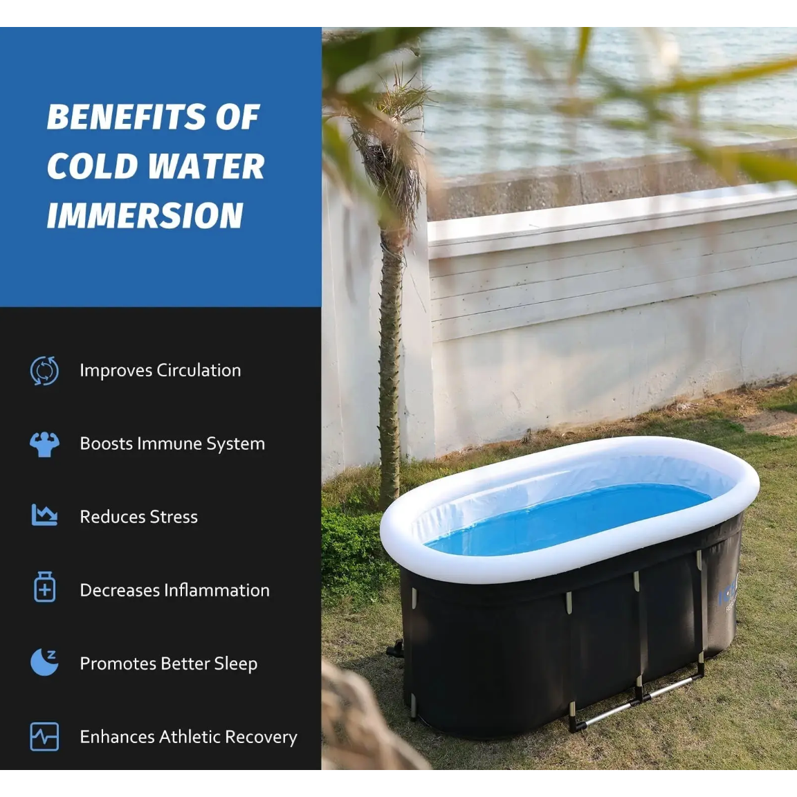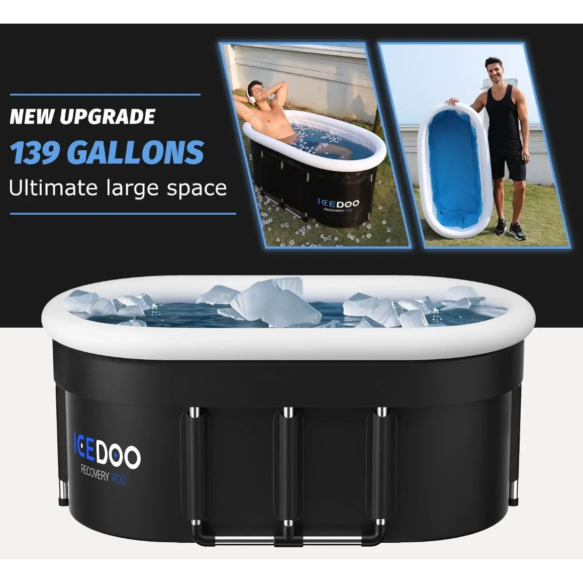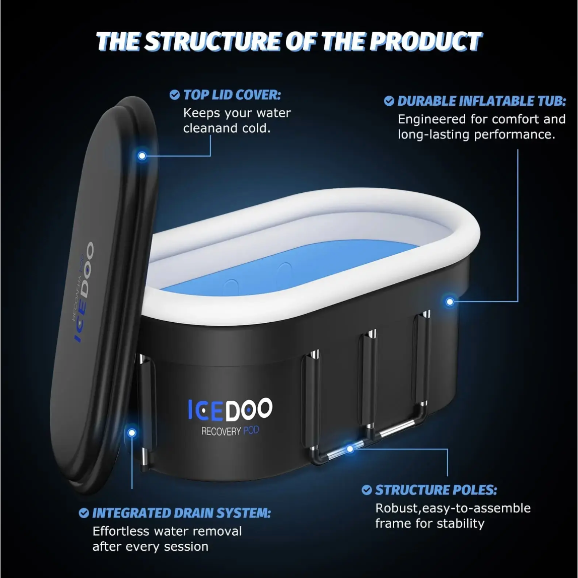 Transform your home into a high-performance recovery zone with the ICEDOO Recovery Pod. Designed to accelerate muscle recovery, reduce inflammation, and sharpen mental clarity, this premium cold plunge tub delivers professional-level therapy anytime you need it. Built with advanced 6-layer thermal insulation and a reinforced aluminum alloy frame, it helps maintain optimal water temperatures longer while supporting full-body immersion for users up to 6’5″. The ICEDOO Recovery Pod is ready to use in just 3 easy steps—simply unfold the tub and secure the oval frame (setup takes just minutes), fill it with cold water and ice (or hot water for heat therapy), then step in, sit back, and experience the revitalizing power of cold plunge therapy right at home or outdoors. The spacious 132-gallon capacity, weatherproof insulated lid, and quick-drain system make it convenient for daily use, while the included carry bag allows for compact storage. Backed by a 2-year warranty, this recovery essential brings spa-quality results straight to your backyard.